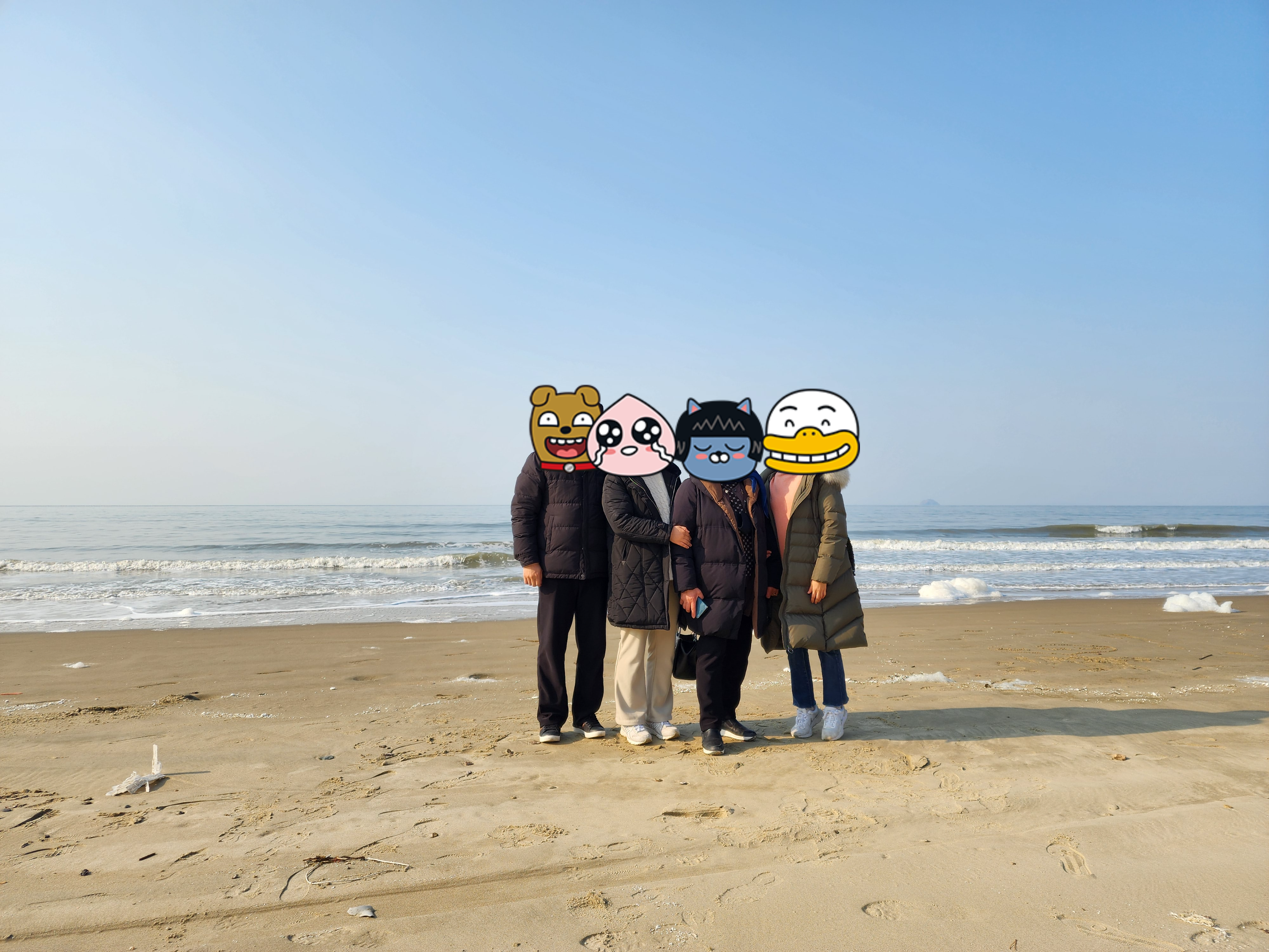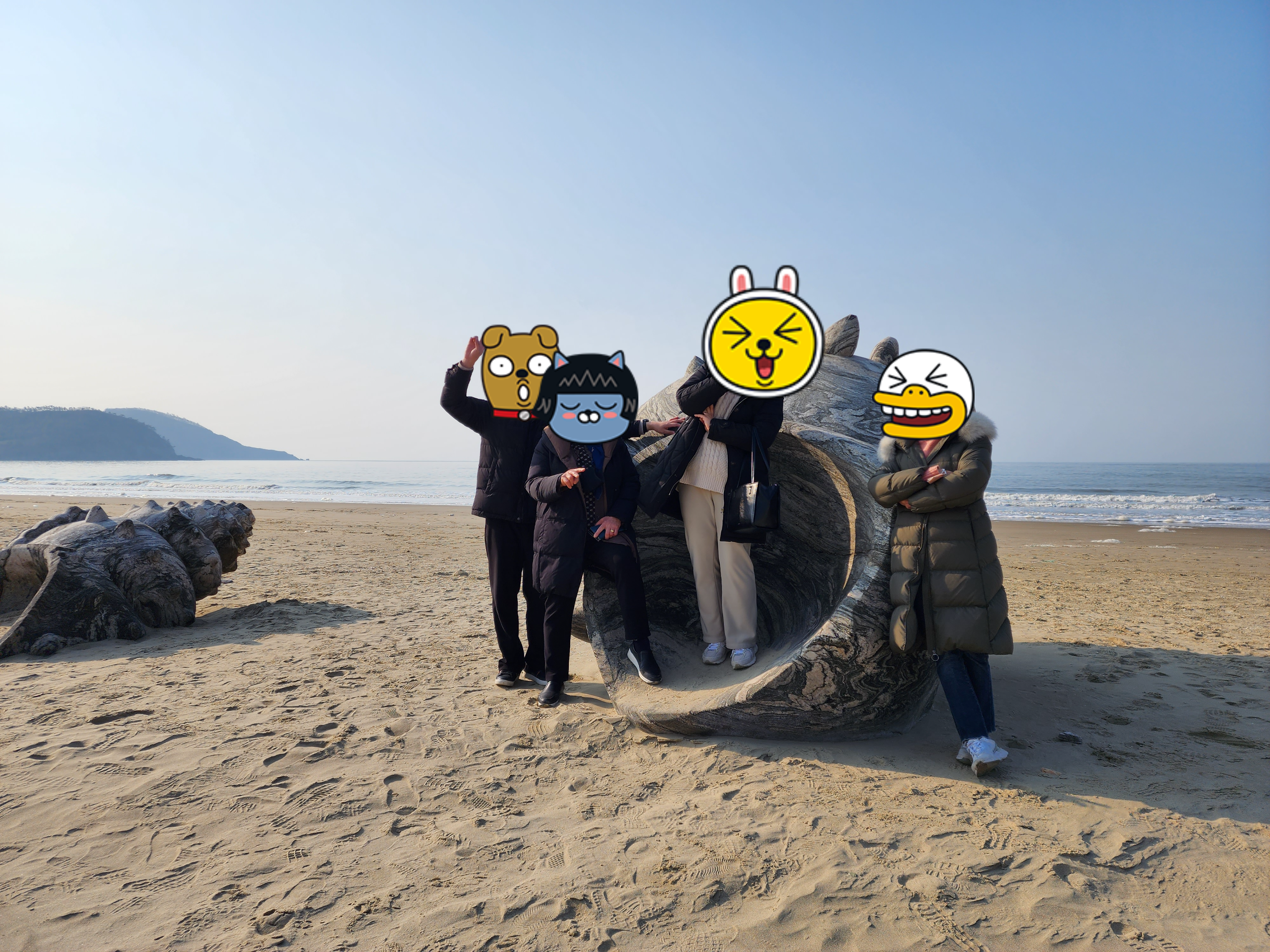 다들 기념사진을 찍는 모래 위 거대한 소라에서 어머니와 기념 촬영!
