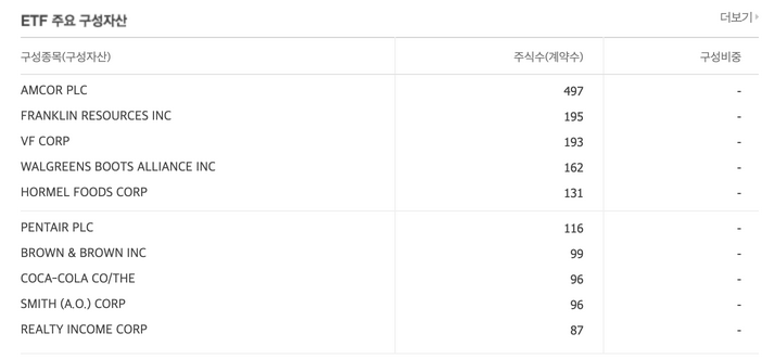 ...해당 ETF는 미국을 대표하는 3대 지수 중 하나인 S&P500 지수의 구성종목 중 최소 25년 이상 매년 주당배당금이 증가한 기업으로 구성된 'S&P500배당귀족 지수(S&P500 Dividend Aristocrats Index)'를 추종한다. 주요 종목으로는 미국의 리튬 등 2차전지를 대표하는 기업 앨버말(Albemarle Corp), 다국적 의료 서비스 회사 카디널 헬스(Cardinal Health Inc), 100년이 넘는 역사를 지닌 글로벌 곡물회사 아처-대니얼스-미들랜드(Archer-Daniels-Midland Co) 등이 있다.