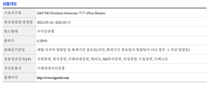"TIGER 미국S&P500배당귀족은 ETF는 미국 주식을 주된 투자대상자산으로 하며, “S&P 500 Dividend Aristocrats 지수(원화환산)”를 기초지수로 하여 1좌당 순자산가치의 변동률을 기초지수의 변동률과 유사하도록 투자신탁재산을 운용함을 목적으로 한다.