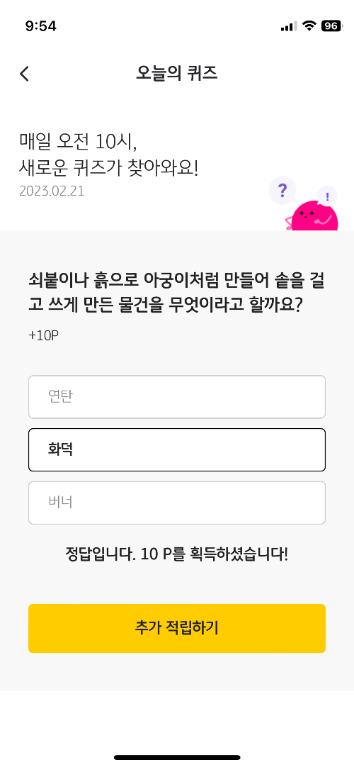 퀴즈는 푸는 재미도 있고 10p씩 적립이 되는데