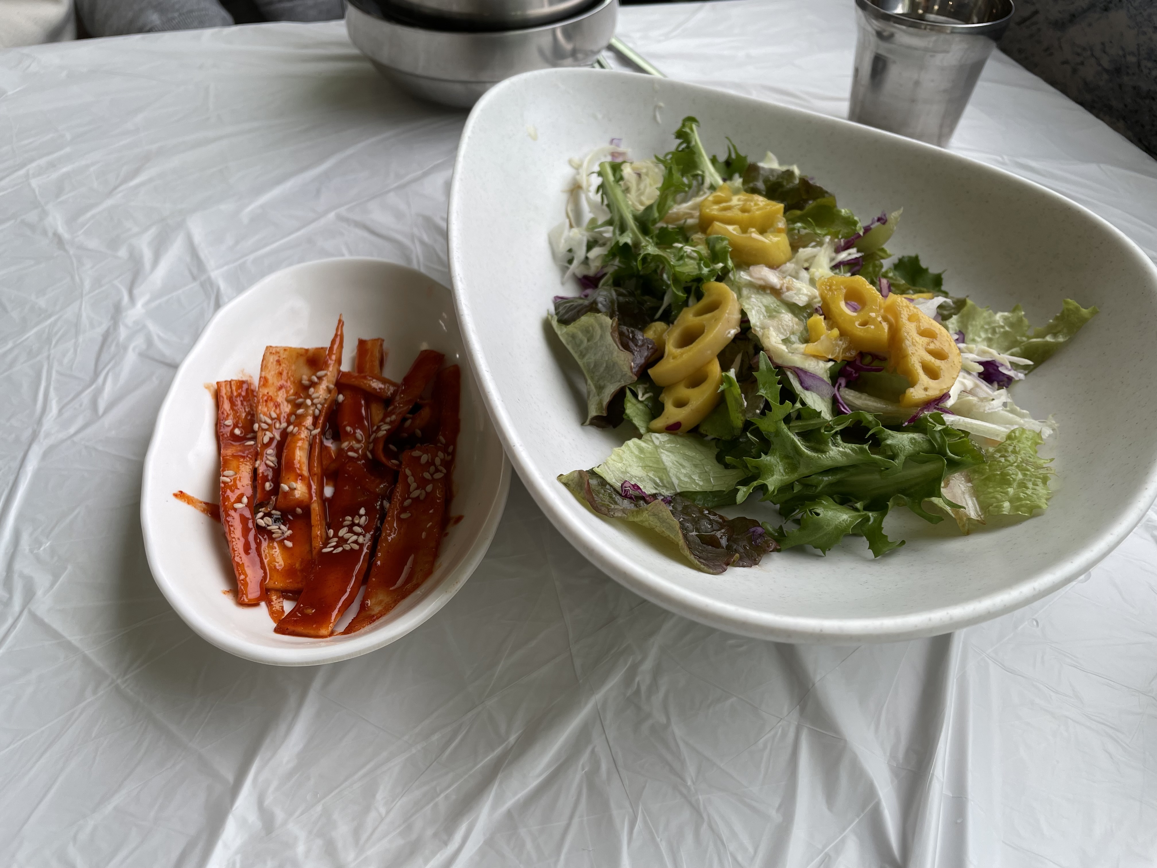 제일 먼저 노란 연근이 들어간 샐러드와 이어서 기본찬들이 나왔다.