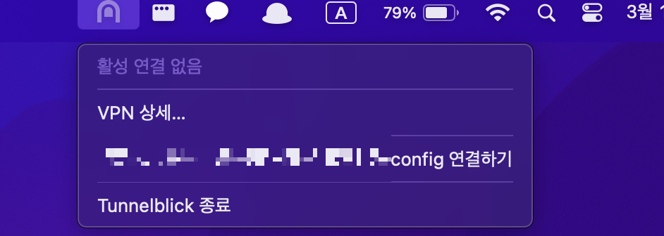 다시 Tunnelblick 아이콘을 클릭하면 추가했던 'ovpn 파일명 연결하기'를 확인할 수 있다.