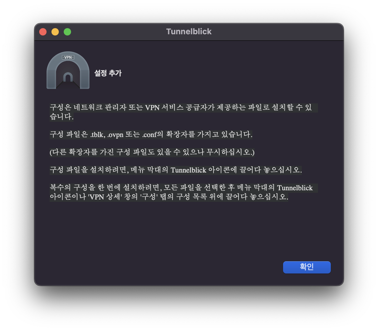 mac에서도 vpn 기능이 있지만 mac용 vpn 클라이언트 tunnelblick를 사용하면 더욱 편리하다.