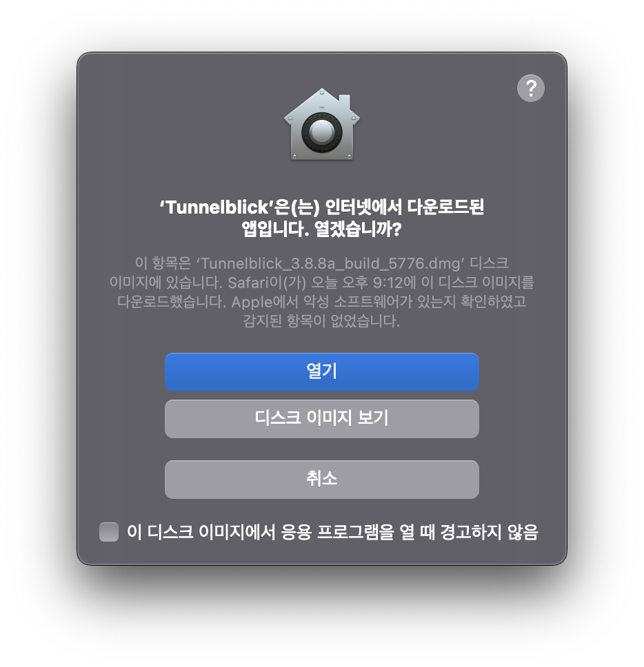 설치 진행을 위해 Tunnelblick 아이콘을 더블 클릭 한다.macos는 외부에서 다운로드된 앱에 대해서는 경고창을 띄운다.