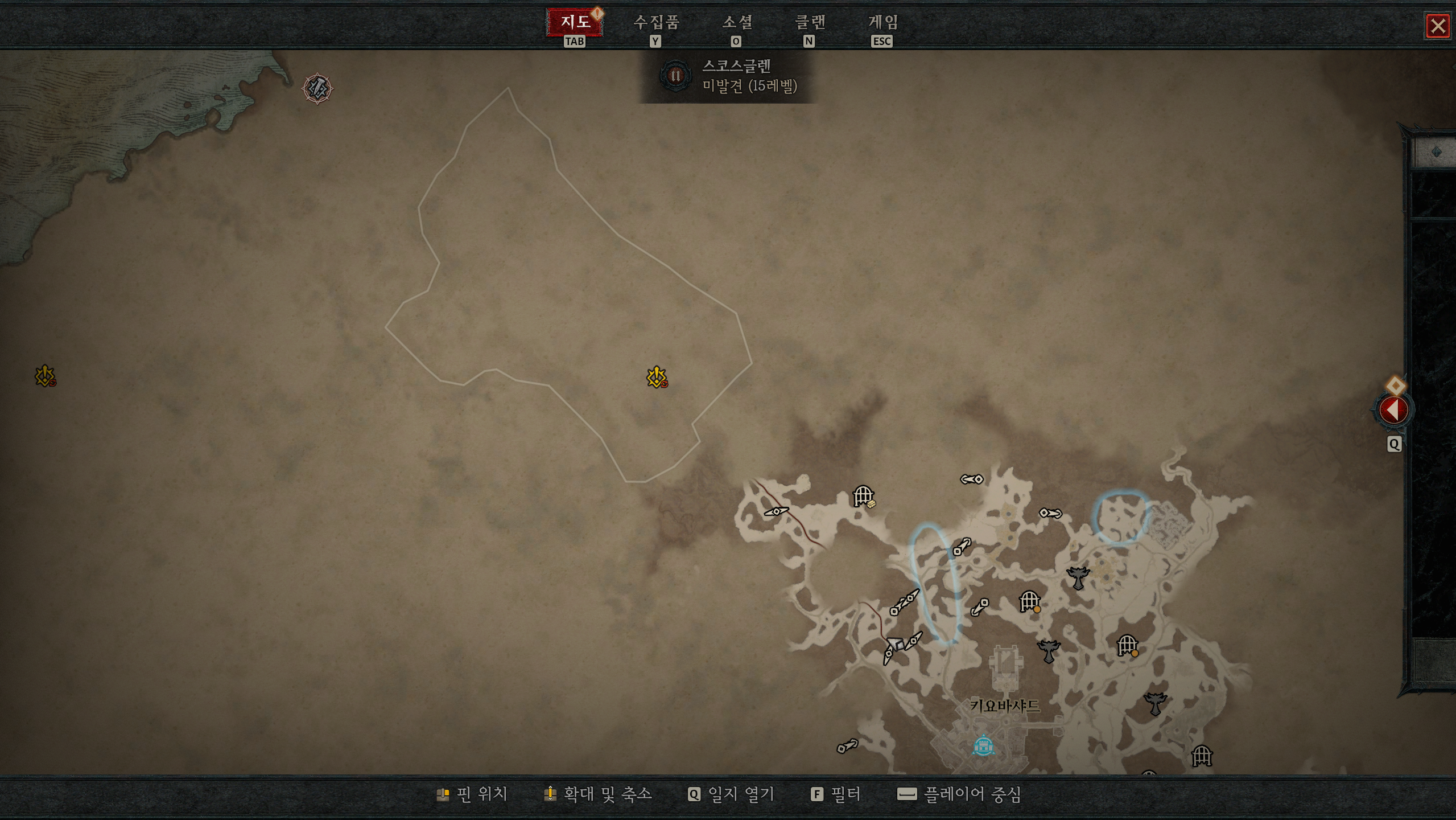 왜 알수 없음이나면 위 지도에 표시된 하얀색에 못그림이 그려진 곳이 퀘스트 첫 시작점이었기 때문이다. 이 점을 블리자드에서 모르고 오픈베타를 진행했는지는 알 수 없지만 참 황당했다. 엑트1의 완료레벨을 몇으로 기준을 잡았는지 알 수 없지만 캐릭터 레벨에 맞춰 몬스터 레벨이 따라가는 설정으로 본다면 적어도 오픈베타의 25레벨이 엑트1의 완료레벨일 가능성이 있다고 본다.