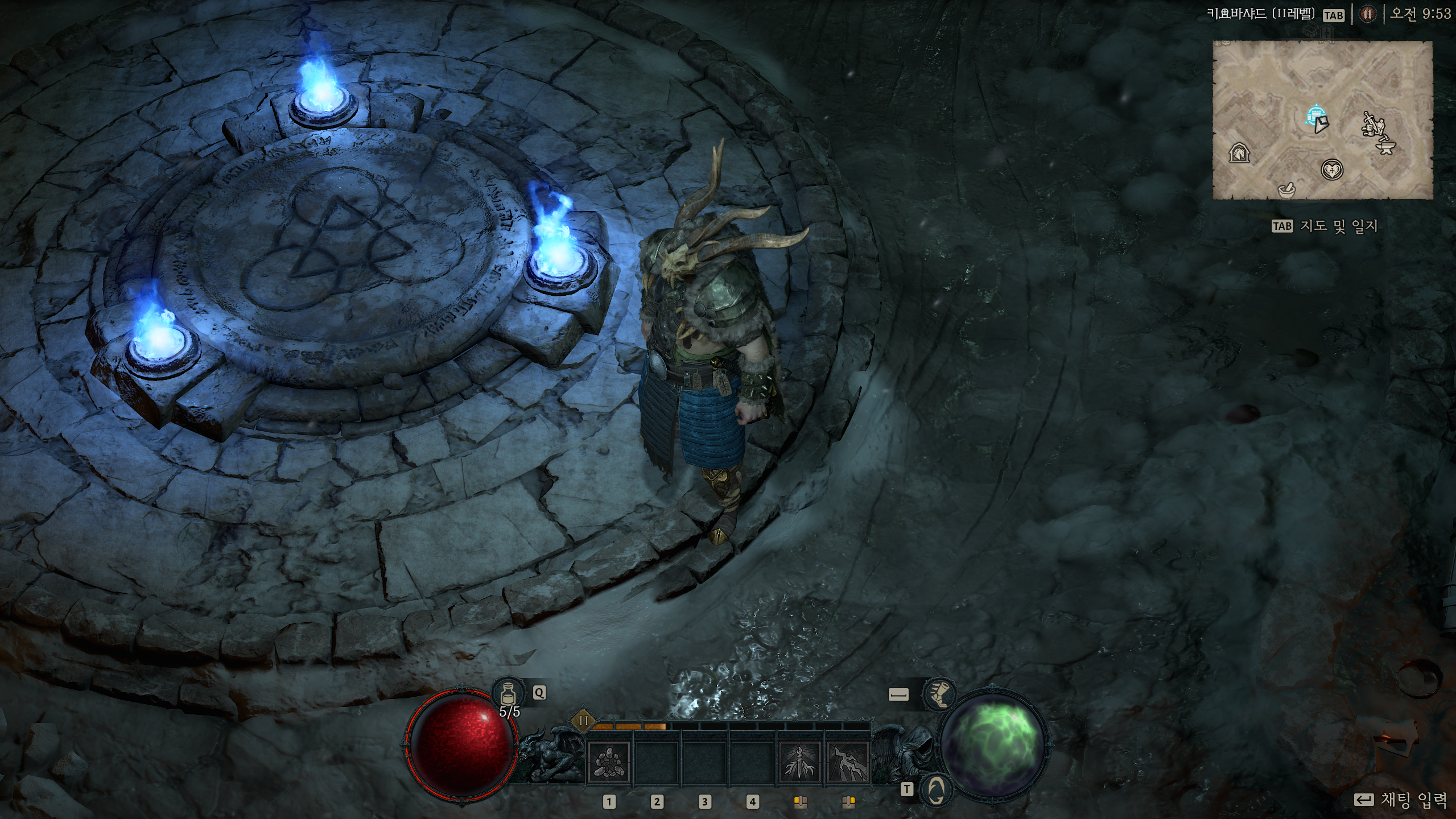 그래서 무기 설정은 양손무기가 아닌 한손 도끼나 철퇴 + 토템이었다. 토템에는 시전에 필요한 정신력 감소 옵션이 있어서 정확히 계산은 하지 않았지만 한손 무기의 빠른 속도 + 정신력 감소로 답답함은 해결했다.